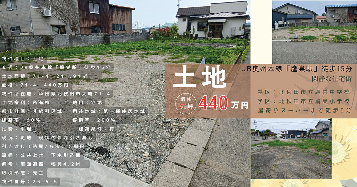 【売地情報】秋田県北秋田市大町② 2025.06.06不動産情報, 売地 Tweet Share +1 Hatena RSS feedly Pin it ダウンロードはこちら 土地情報 秋田県北秋田市大町71-4 地目:宅地 公簿面積:211.91㎡ 交通 JR奥州本線「鷹巣駅」徒歩15分 価格 440万円 備考 ・全面道路:幅員 4.2m ・学区:北秋田市立鷹巣小学校・北秋田市立鷹巣中学校 Tweet Share +1 Hatena RSS feedly Pin it 不動産情報, 売地 【商談中】【売地情報】秋田県北秋田市大町① 【売地情報】秋田県北秋田市大町③ 関連記事一覧 【商談中】【売地情報】秋田県北秋田市脇神字平崎上岱 【商談中】【売地情報】秋田県北秋田市大町① 【売地情報】秋田県北秋田市大町③ 【売地情報】秋田県北秋田市宮前町 【中古物件】秋田県北秋田市東中岱